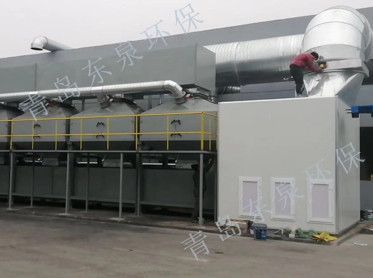 2.经过过滤后的废气,进入后续设备的吸附床,吸附净化的洁净气体排放烟囱,吸附在蜂窝活性炭上的有机物,利用高温气体(100~120℃)对其进行脱附。高温气体来源为后方CO燃烧后的高温空气与自然风混合生成。