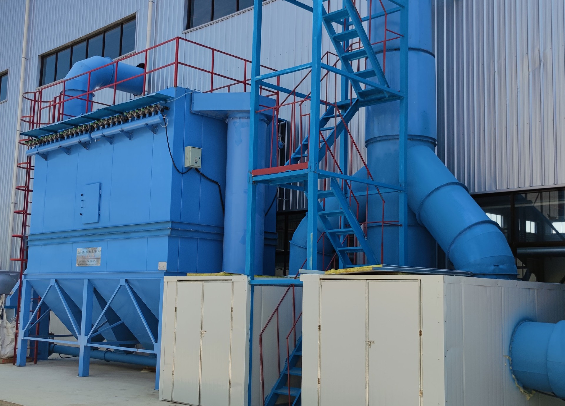 电炉除尘器装置系统为:将来自工业硅生产电炉的烟气,在离心式主风机的抽吸作用下,烟气由半封闭式电炉内引出,沿着烟道首先进入旋风除尘器。把粗粒、火星分离出来,使其沉降于灰斗至卸料器排出。在有旋风除尘器的出口排出,超细粉尘及含尘气体进入一个热交换器,风冷降低烟气温度,然后其它尘粒随气流上升进入布袋除尘器各个袋室。经滤袋过滤后,粉尘被阻留在滤袋外面,净化后的气体由滤袋进入箱体,再通过袋口和上箱体(净气室)出风口进入离心式主风机在排入烟囱至大气。灰斗中的粉尘定时或连续由卸灰系统排出。