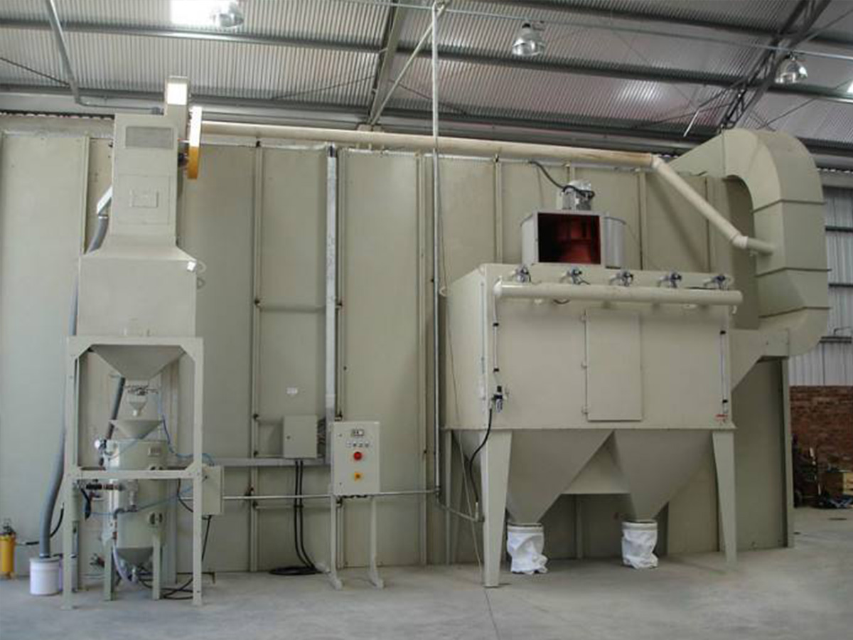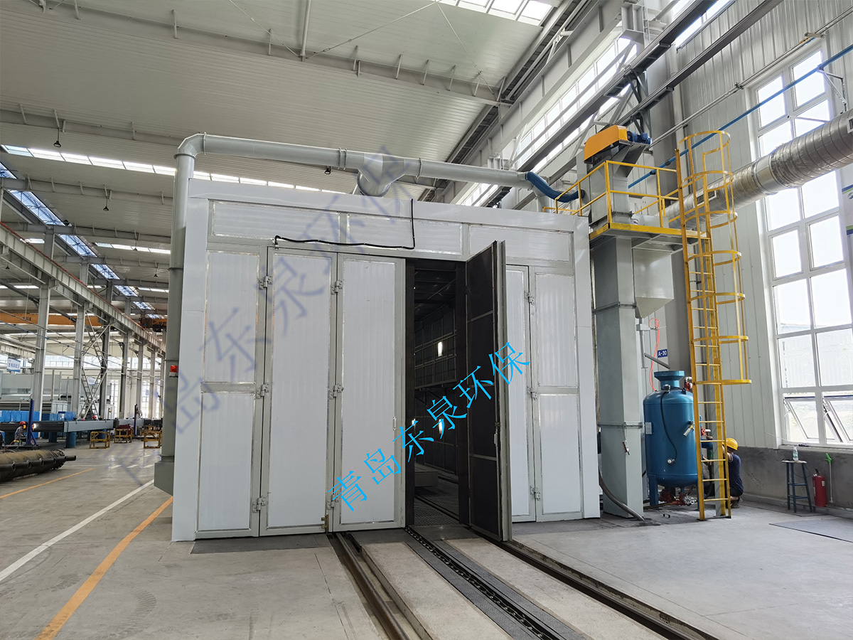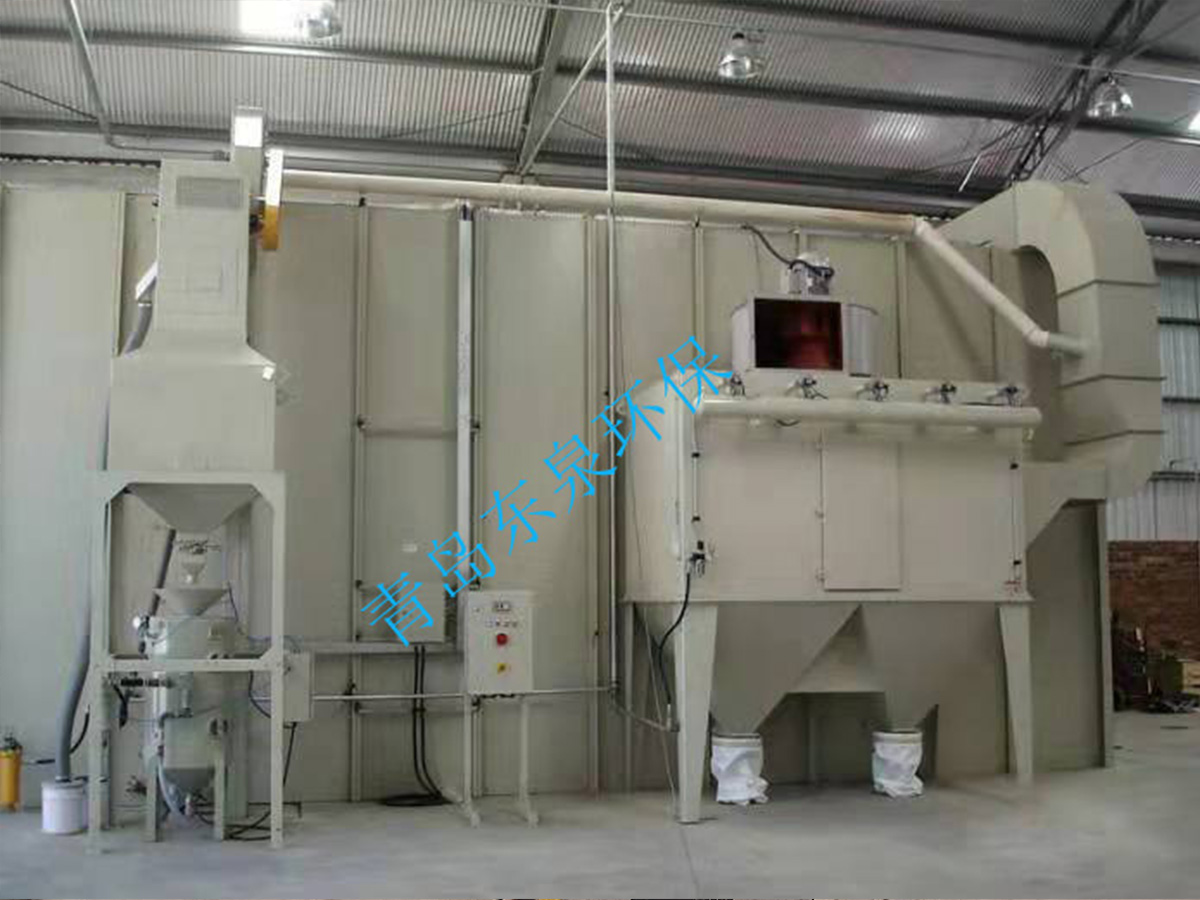 砂料回收、分离及除尘系统的工作原理:喷砂时砂料掉落到蜂窝漏斗里,再由气缸带动刮板往复运动,使落入漏斗内的砂料推送到喷砂房一端的螺旋输送机里面,通过螺旋输送机输送到皮带输送机内,皮带输送机等把砂料送入风选分离器中,风选分离器将砂料分离至储料斗,从而保持砂料的清洁度和纯度,有用的砂料进入储砂罐内继续循环使用,粉尘及污物则随气流进入除尘系统内,经过除尘系统的过滤、干净空气排入大气,粉尘及污物则储存在粉尘筒中等待定期清理。